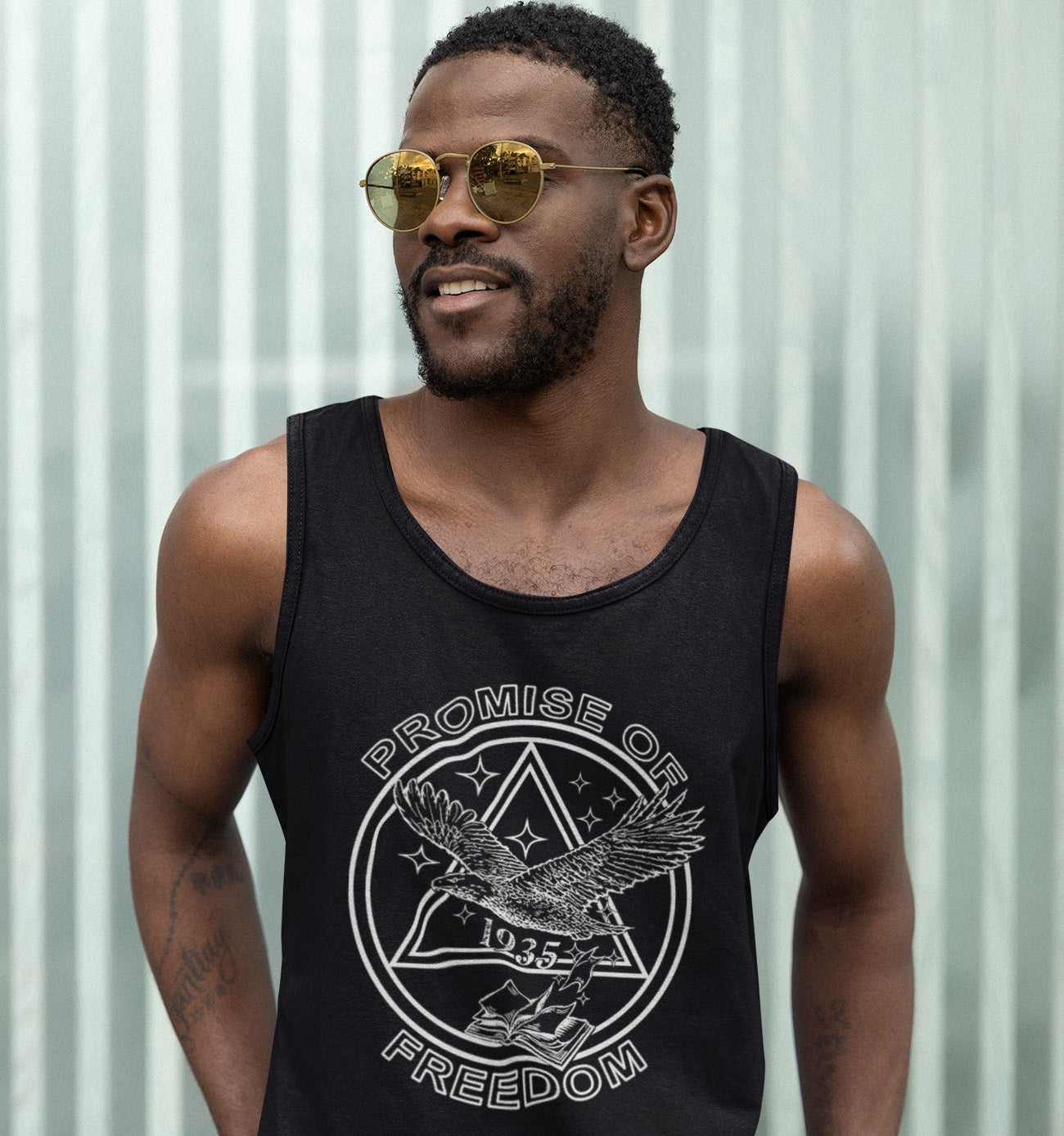 "We are going to know new freedom and a new happiness" AA Big Book. This tank top encompasses one of our Big Book promises with an eagle that symbolizes freedom. A bold font with a discreet AA symbol and the year the fellowship was born. This high-quality silk-screened shirt will last almost as long as you do. This classic cotton tank top will be an instant favorite in your recovery wardrobe.