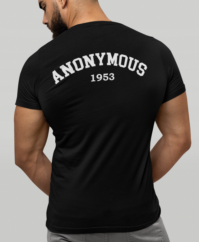 A dear friend requested this simple Anonymous 1953 design, so here it is. I chose a bold collegiate font face to make it look official. The back image measures 10" x 3" and the front chest area logo measures 3.5". This 100% pre-shrunk cotton tee's casual elegance will make it an instant favorite in your recovery wardrobe.