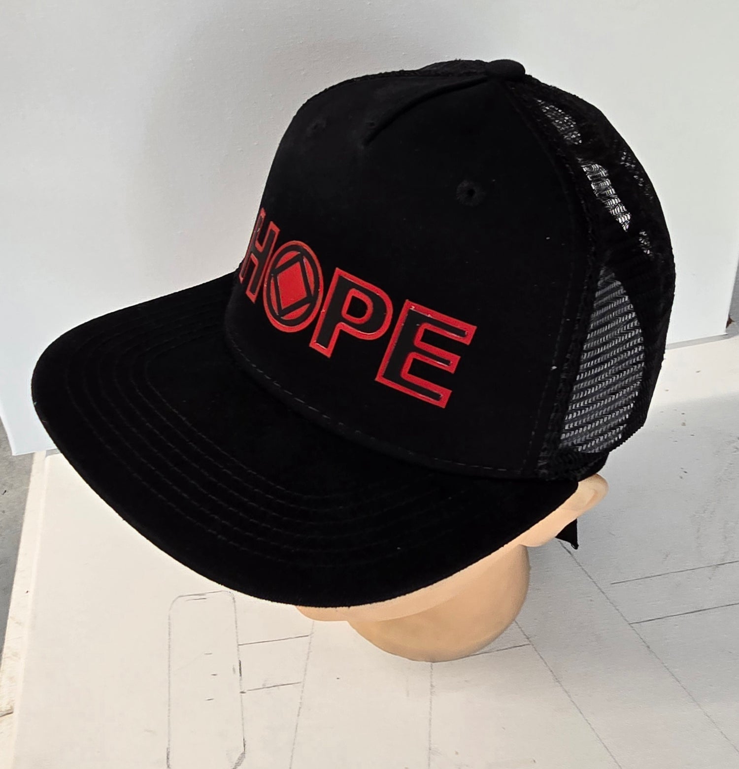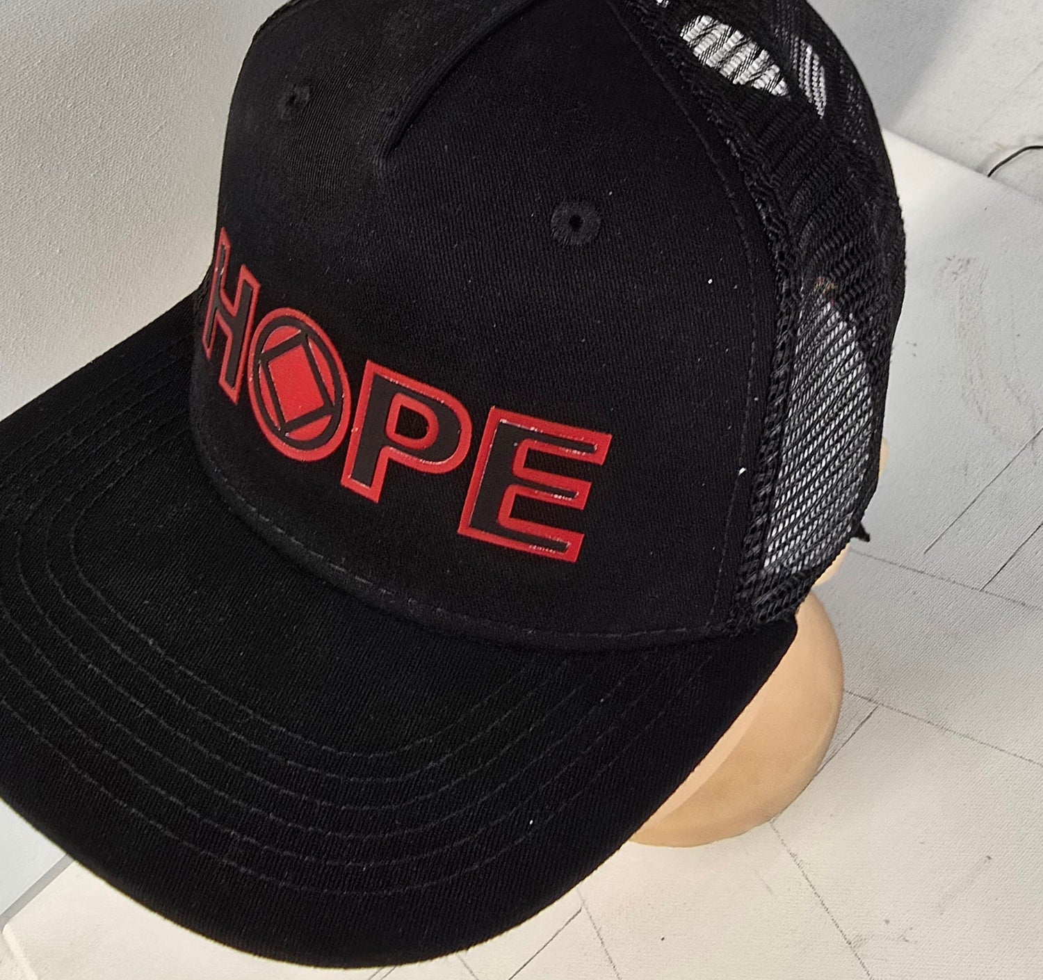 This stylish SnapBack Ball Cap is Black with a black mesh back and black and, red lettering. This cap features the word hope with an NA service symbol in the position of the letter "O." The smooth yet thick image pops off the hat about 1/8f an inch, as you can see in the picture.