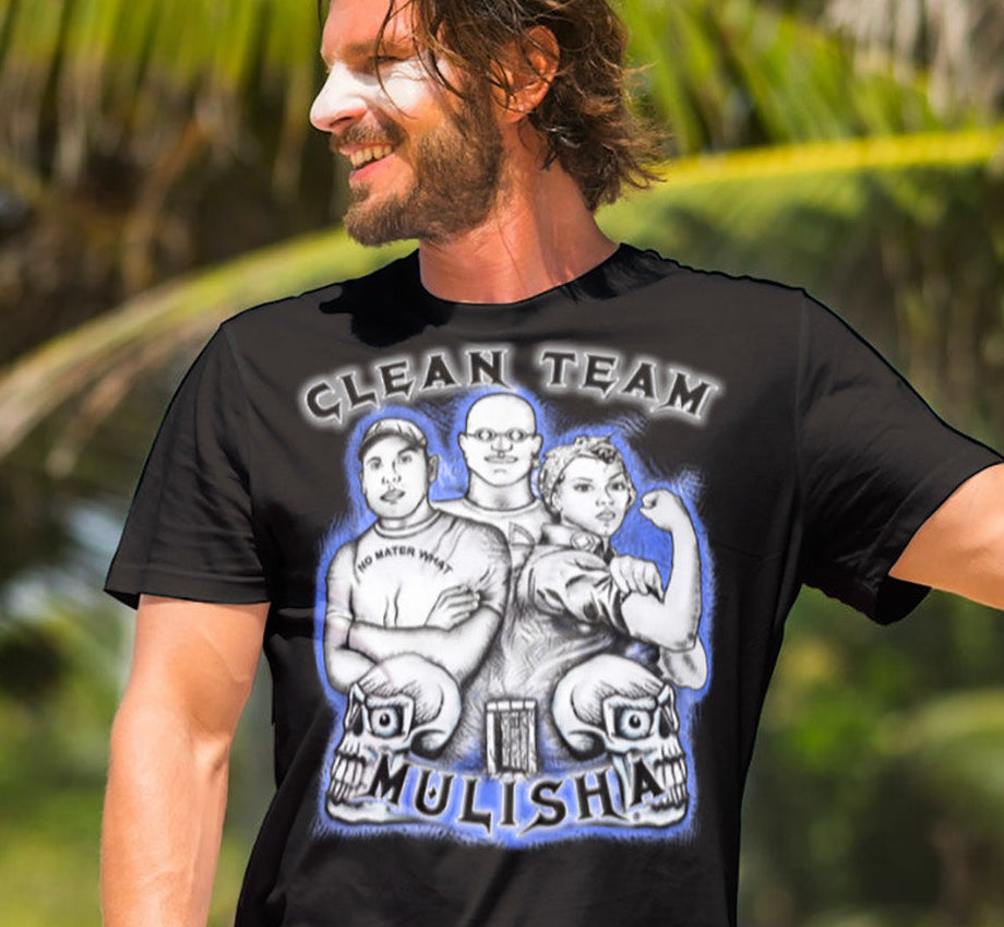 This fantastic design is one of my classic designs with a long history. Featuring three familiar characters, some skulls, and the words "clean team mulisha," this is a very youthful design. And no, mulisha is not misspelled. A direct-to-garment printing process produces this highly detailed image, which takes up a large portion of the front side. This heavy cotton tee has a classic cotton look and feel. This classic cotton t-shirt will be an instant favorite in your recovery wardrobe.