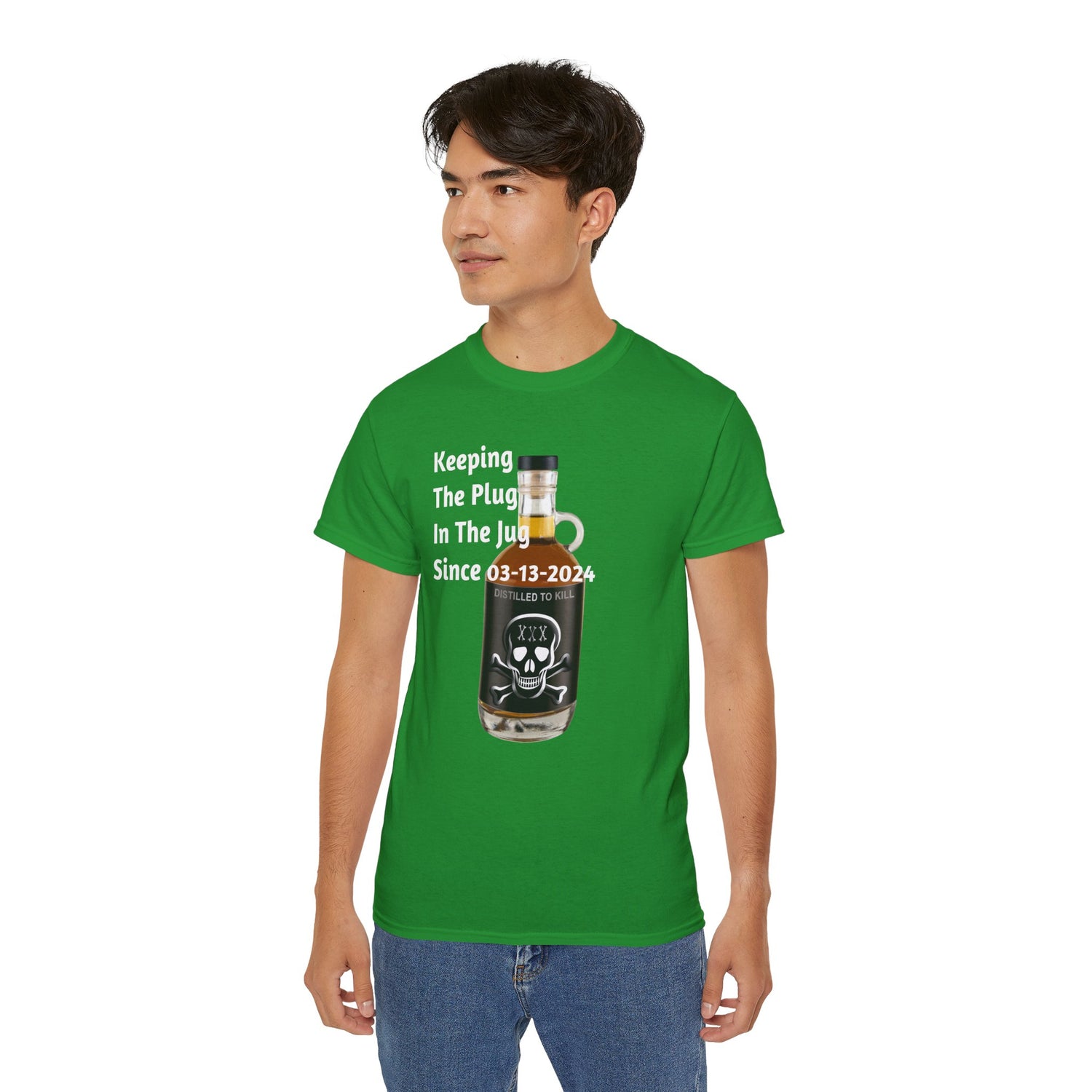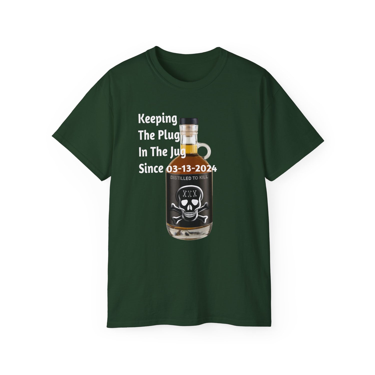 This design takes the AA slogan "Keep the Plug In The Jug" and turns it into what appears to be an advertising campaign T-shirt. What's even more amazing is your ability to customize this design with your sobriety date. The crisp, clean image takes up a large portion of the shirt's front. A direct-to-garment printing process produces this highly detailed and soft-to-the-touch image. This heavy cotton tee has the classic cotton look and feel. Casual elegance will make it an instant favorite in everyone's recovery wardrobe.