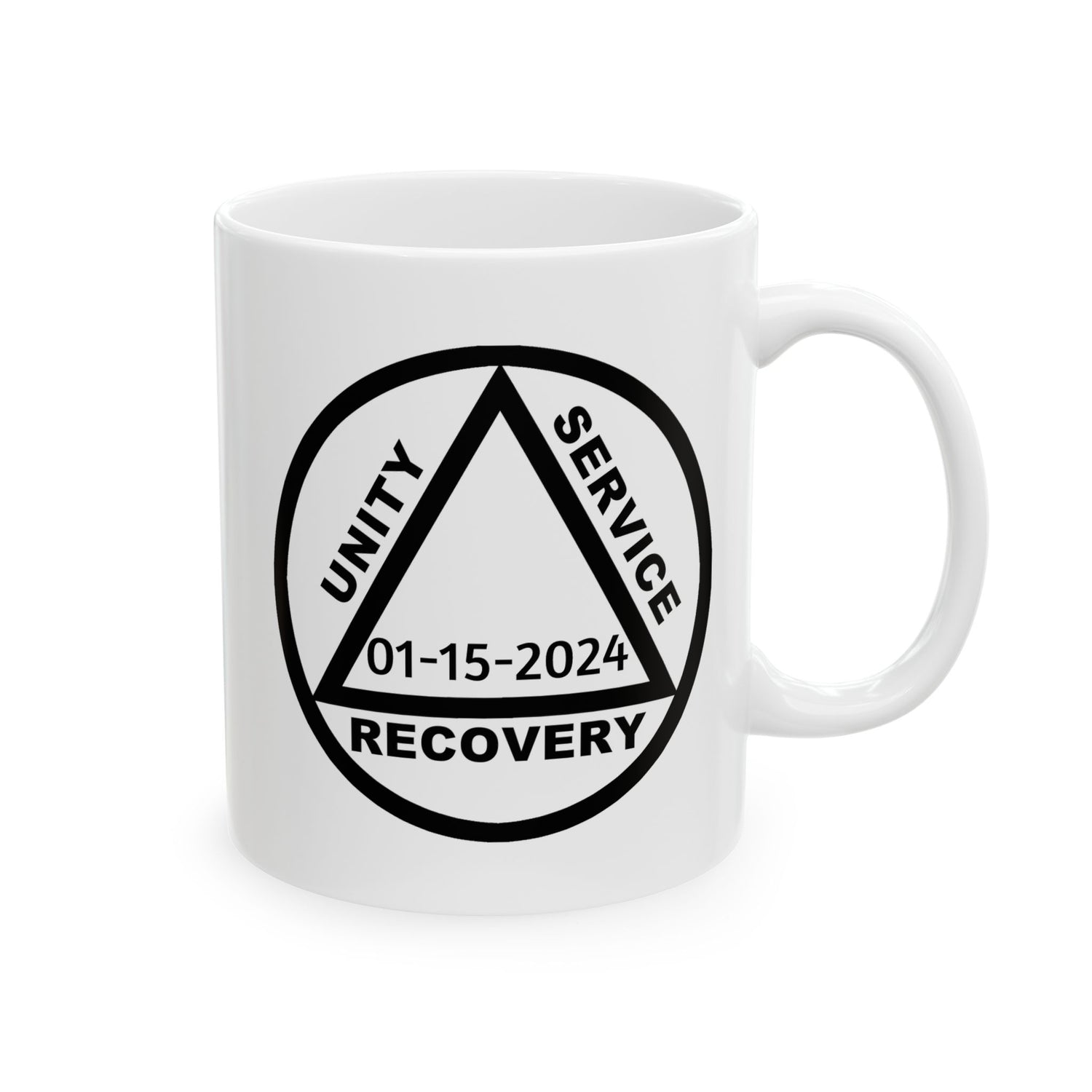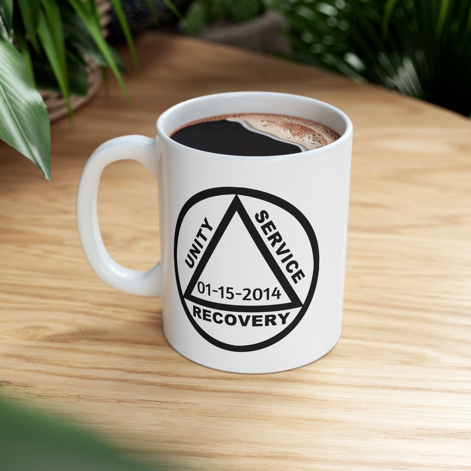 You can customize this white 12 or 15oz ceramic mug with your sobriety date or year. Text size will depend on whether you choose the year or the sober date.
