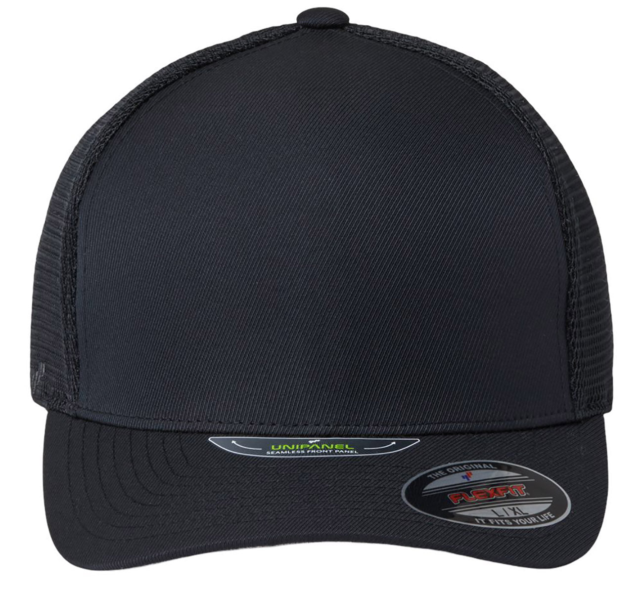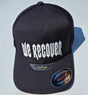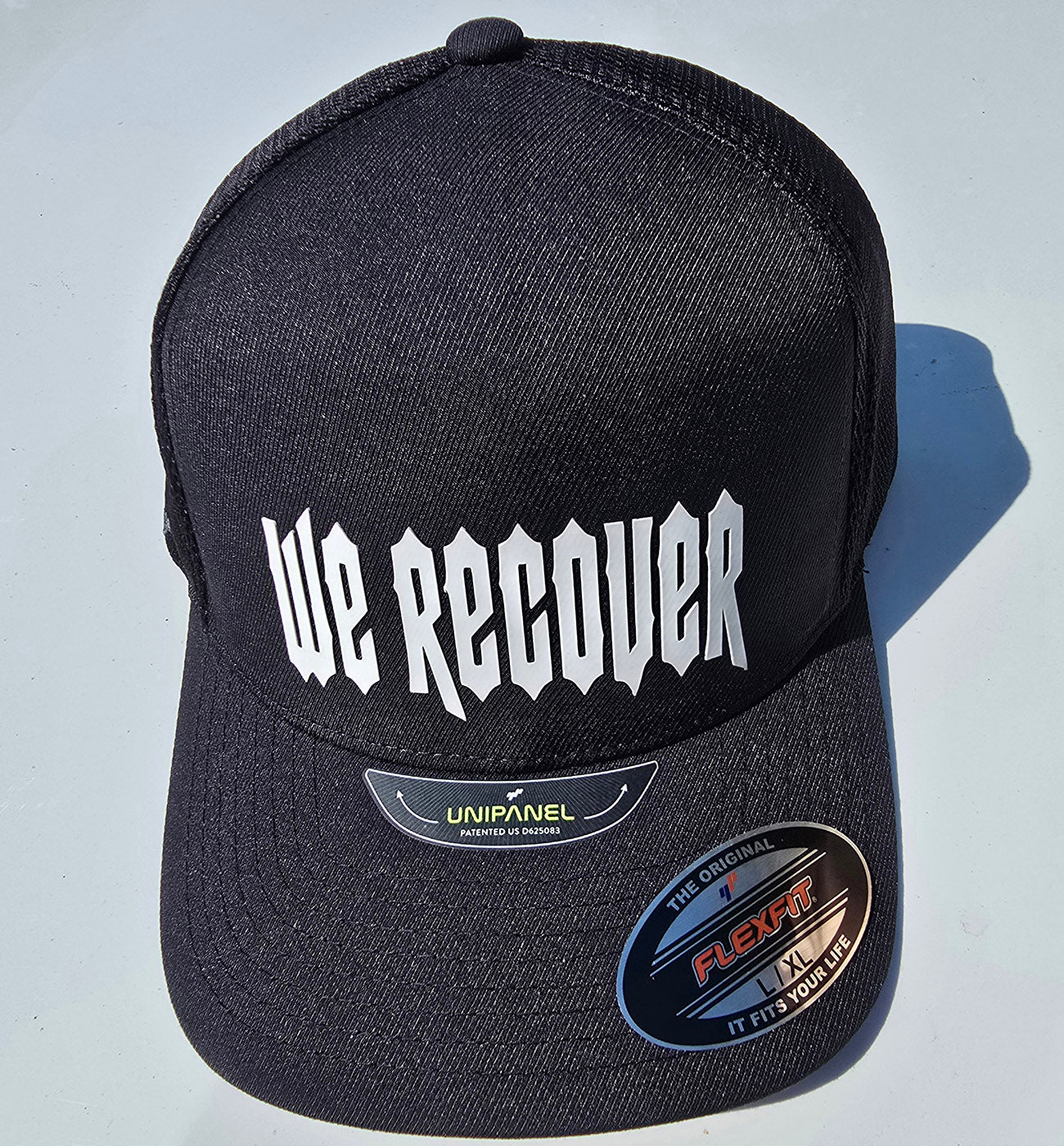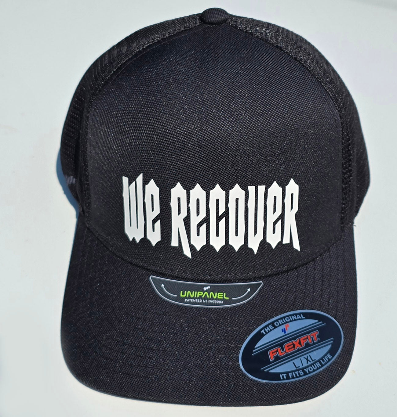 This stylish Flex Fit Ball Cap is Black, with a black mesh back and black lettering. It features our cool We Recover hat design. The smooth yet thick image pops off the hat about 1/8 of an inch, as you can see in the picture.
