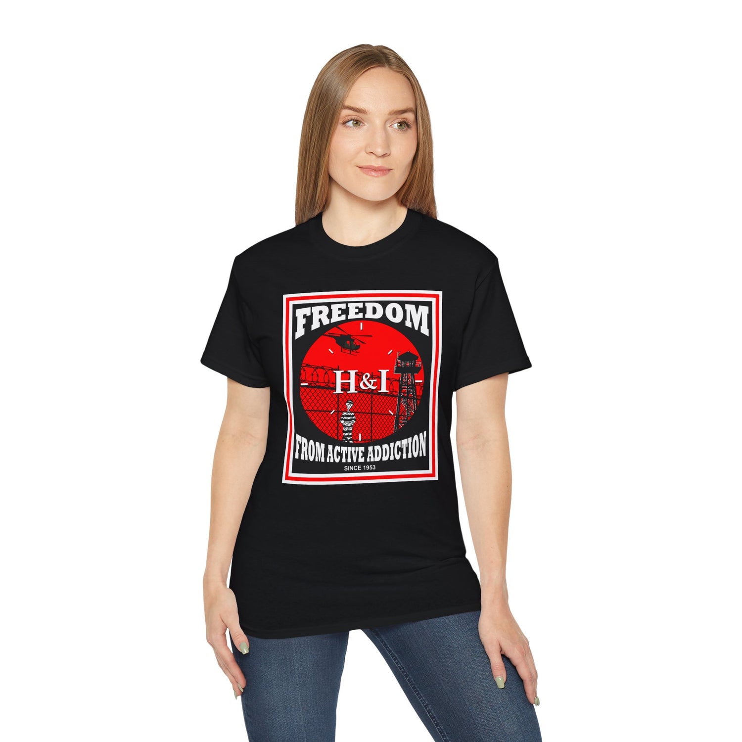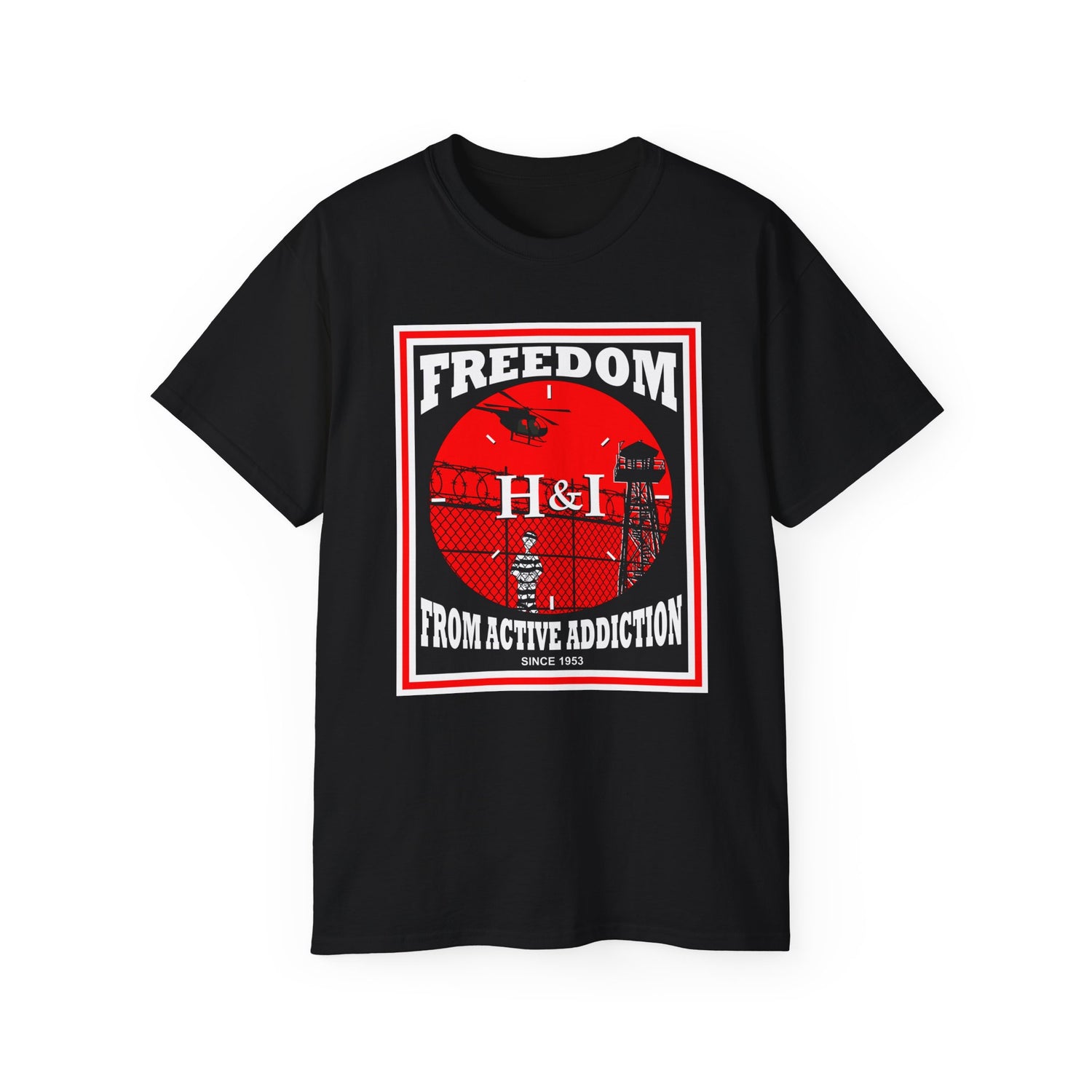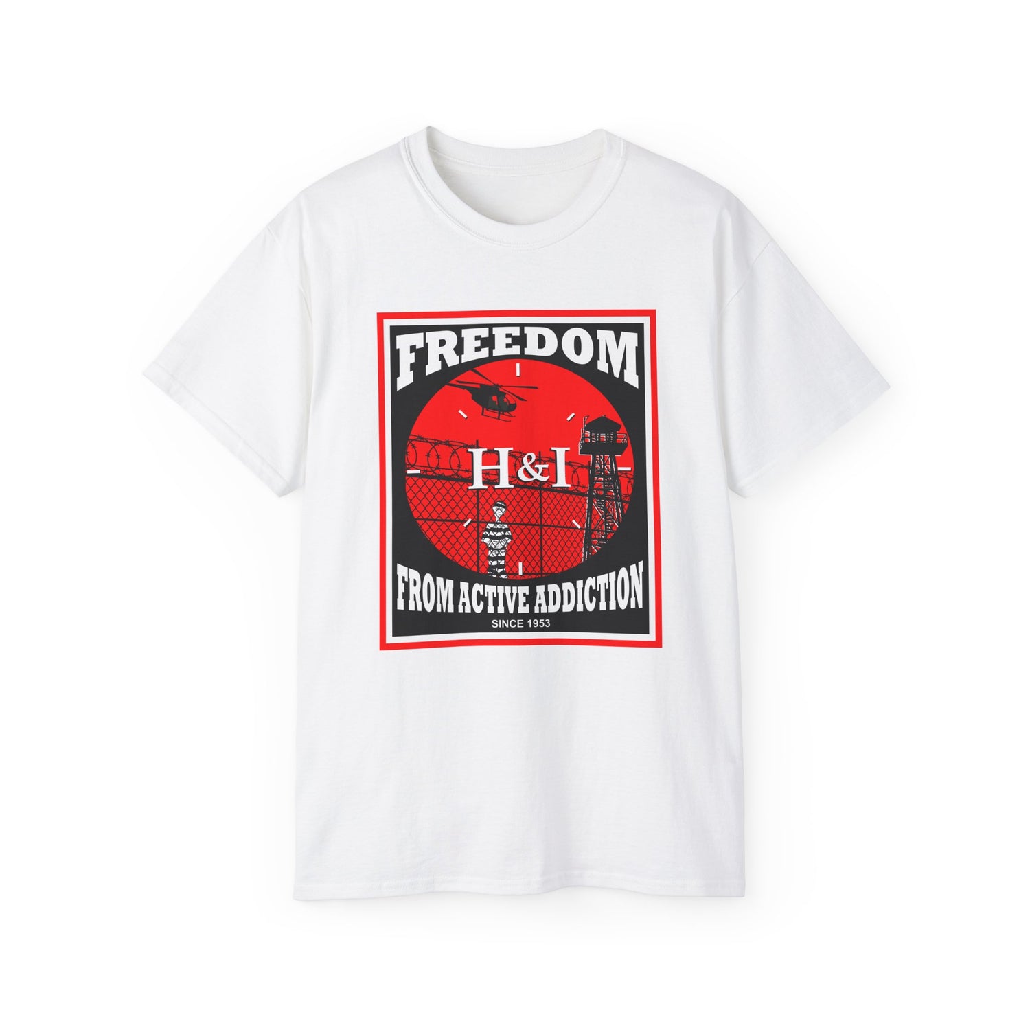 I created this bold design for the NA member carrying the message on the front line through H&I. It is genuinely a classic NA H&I design with a straightforward message. The DTG-printed image is large, crisp, clean, and soft to the touch. The high-quality image measures 9" x 11". This classic design on a 100% cotton tee will surely be an instant favorite in your recovery wardrobe.