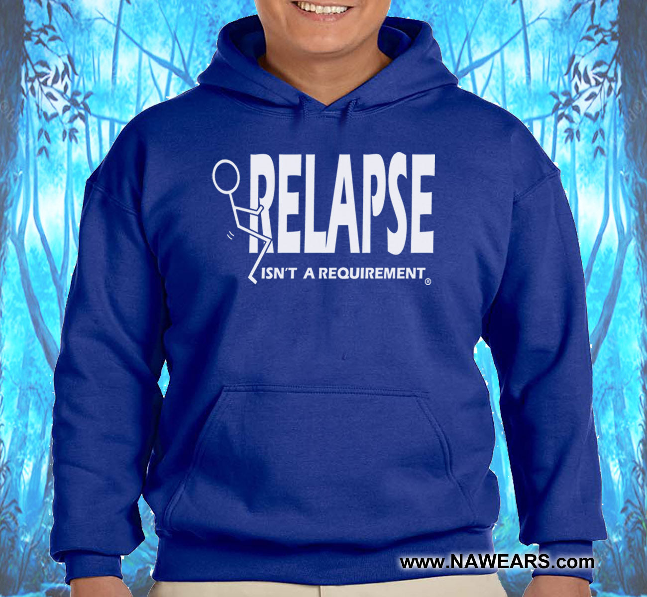 This cool hoodie reads "relapse isn't a requirement." A statement right out of the NA Basic Text and a fundamental belief of any recovery program. The image is on the front and back, it measures 10" x 6". The 50/50 cotton/poly blend makes this hoodie not only breathable but also flexible and durable. With quality, comfort, and style, this hoodie features double-needle stitching and 1x1 ribbed cuffs & waistband.