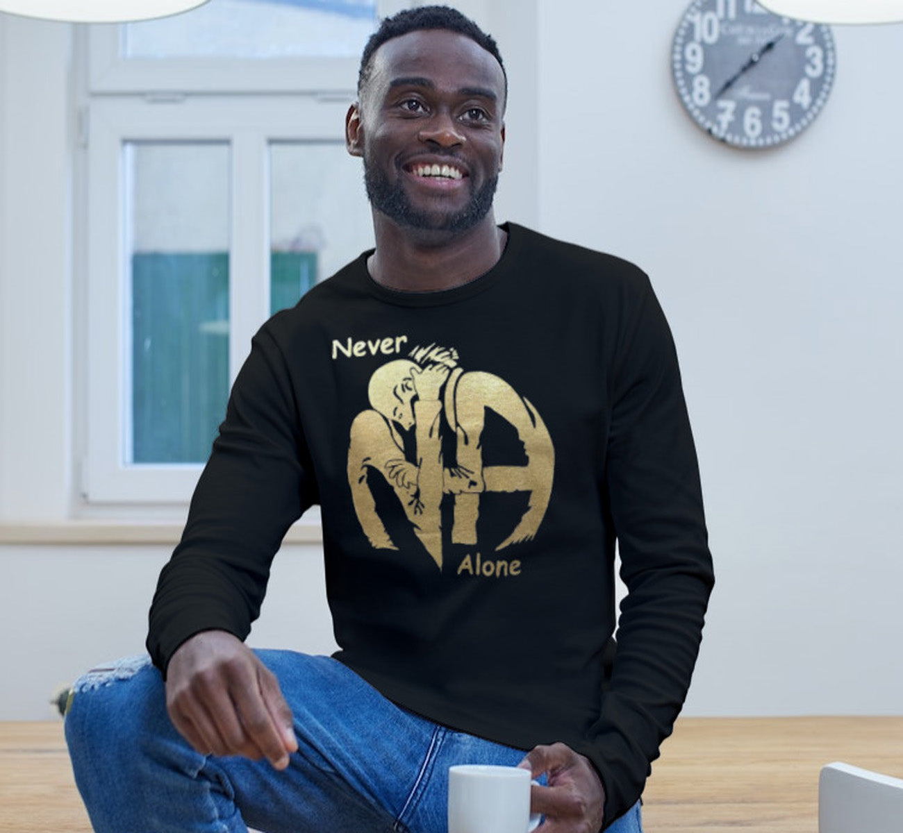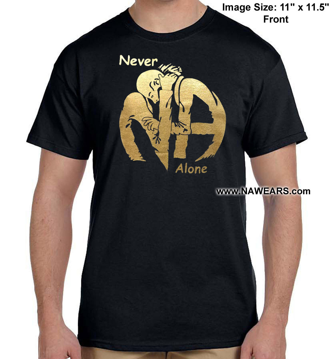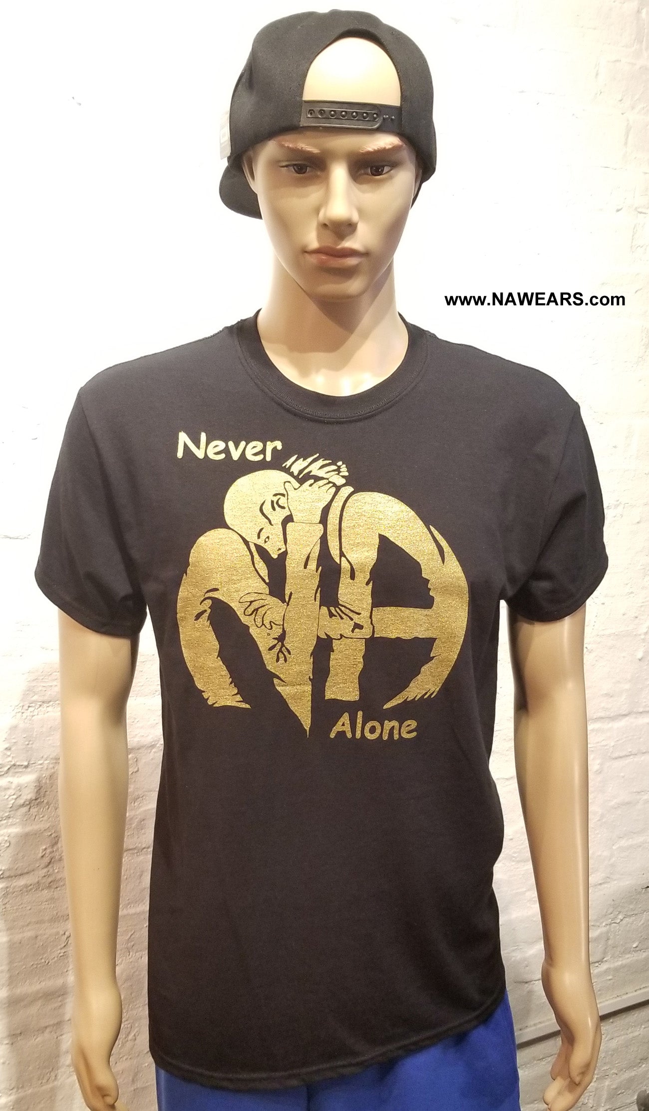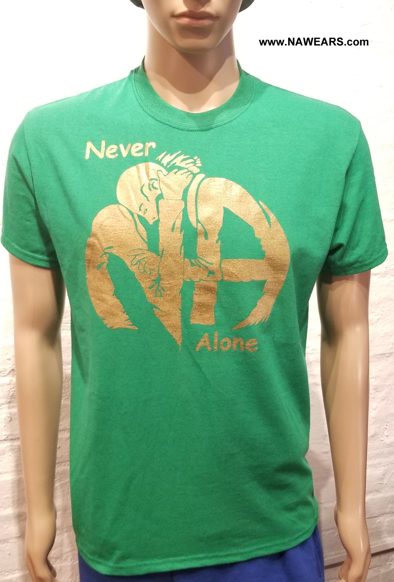 NA members are known worldwide for being huggers, so we created an NA logo with two guys hugging and the words "never alone." This shirt's silk-screened 11" x 11.5" rich gold image will not fade. I chose shirt colors that looked great with the rich gold ink. This 100% pre-shrunk cotton tee has a classic look and feel. The casual style will make it an instant favorite in your everyday wardrobe.