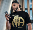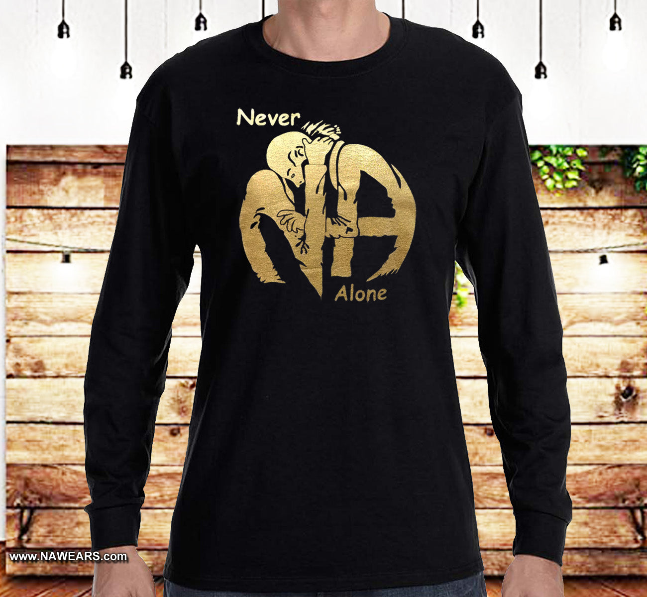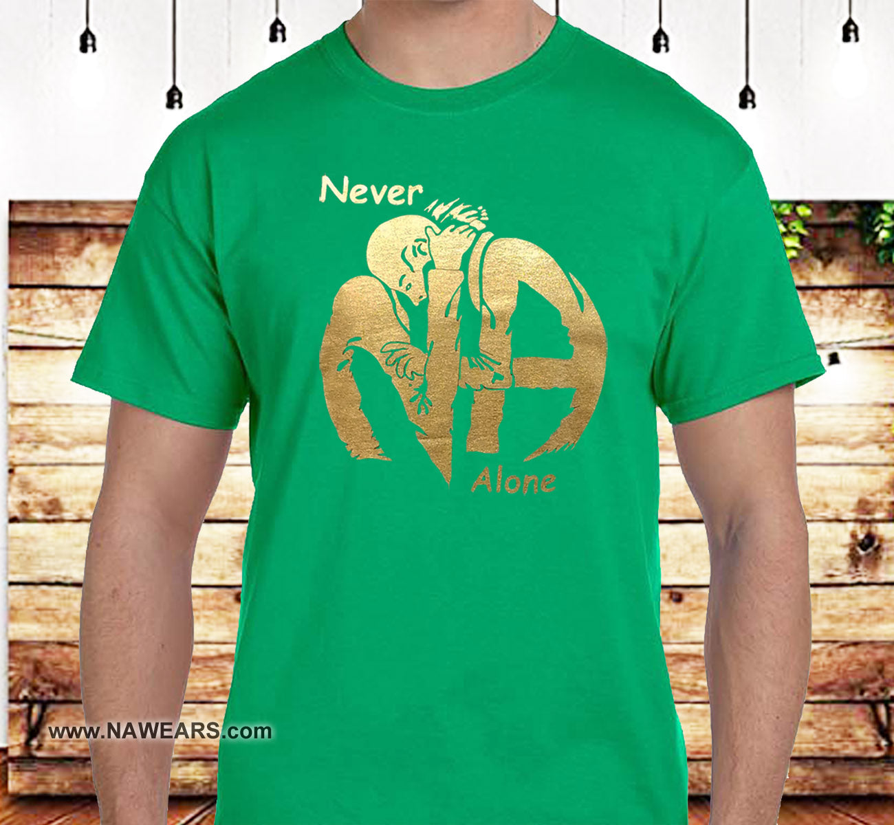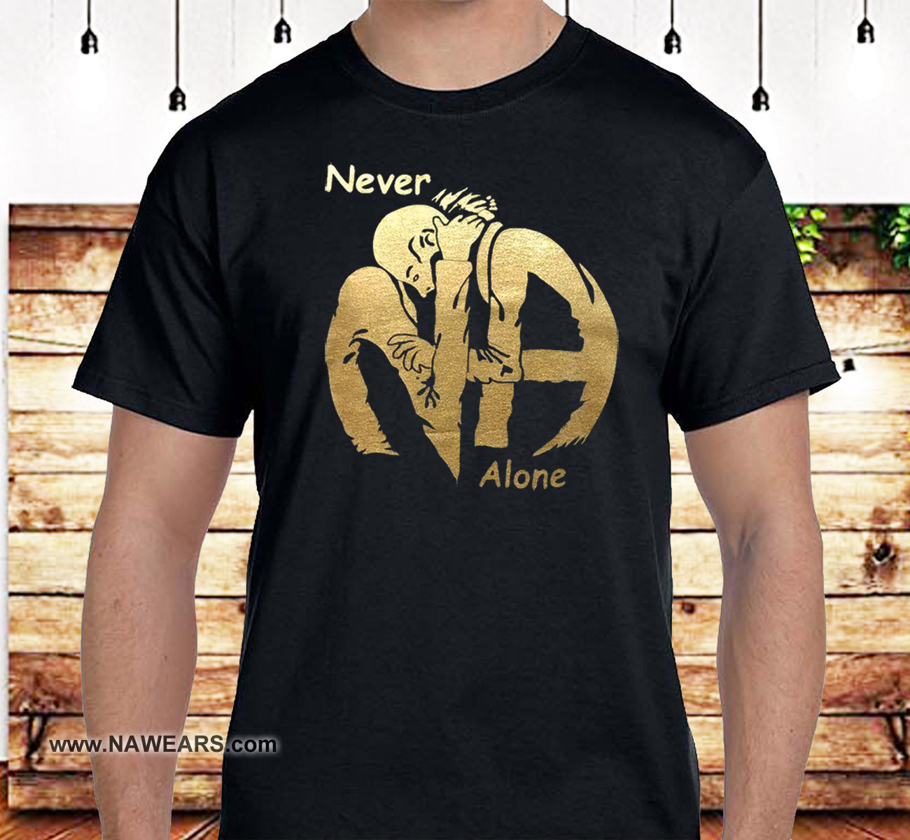 NA members are known worldwide for being huggers, so we created an NA logo with two guys hugging and the words "never alone." This shirt's silk-screened 11" x 11.5" rich gold image will not fade. I chose shirt colors that looked great with the rich gold ink. This 100% pre-shrunk cotton tee has a classic look and feel. The casual style will make it an instant favorite in your everyday wardrobe.