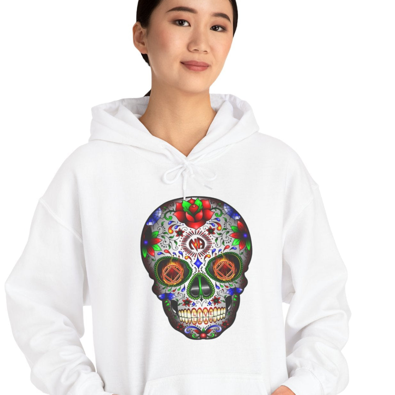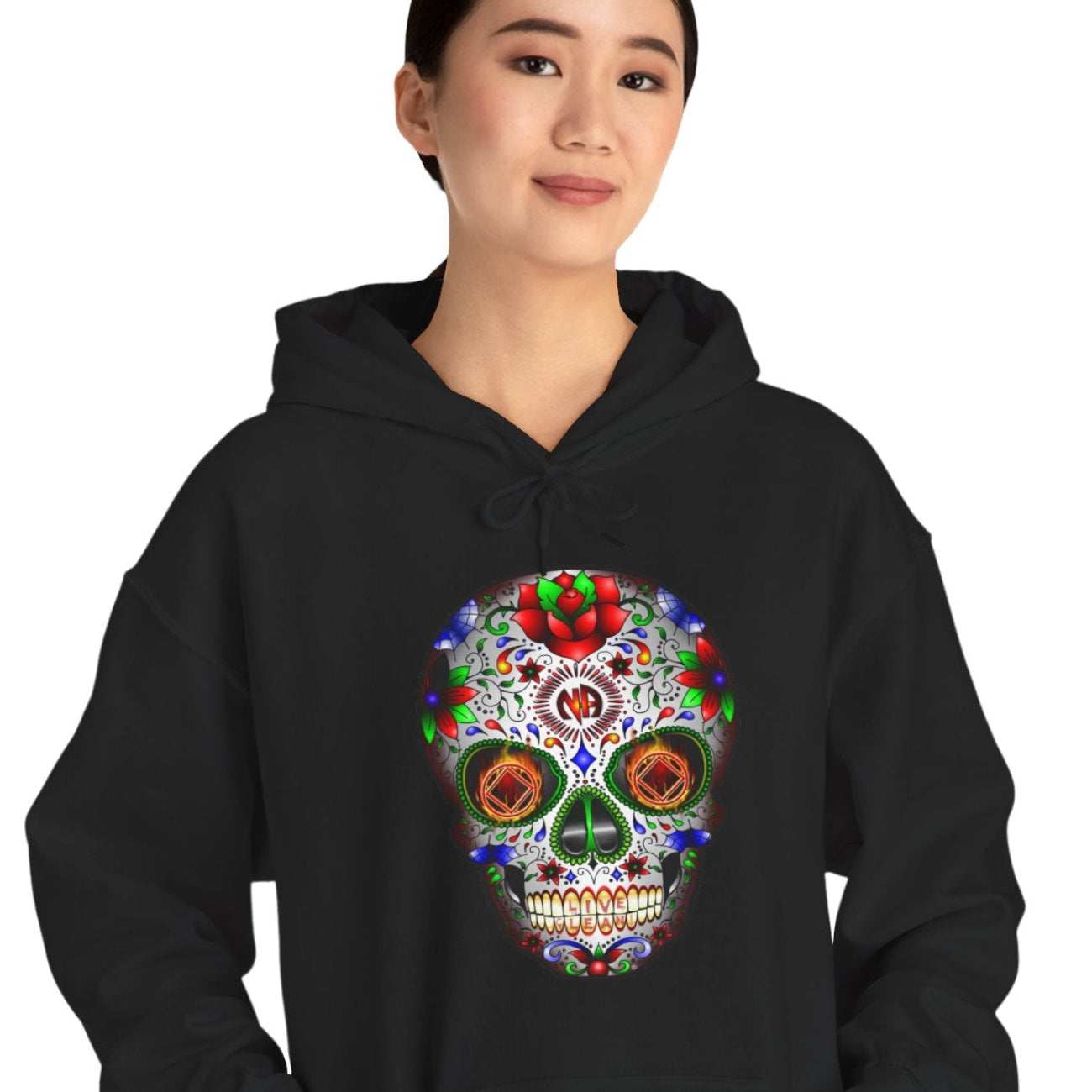 This amazing design is mind-blowing if I say so myself. I spent hours drawing and working on every detail of this design. The color, detail, and size of this design are the way sugar skulls are supposed to be. This is a large image that gets larger as the shirt size increases. I've seen a lot of sugar skull and recovery sugar skull designs out there, and none of them come close to this one. The DTG printing process makes the image soft to the touch. This unisex heavy blend hooded sweatshirt is relaxation itself. Made with a thick blend of cotton and polyester, it feels plush, smooth, and warm, a perfect choice for any cold day.