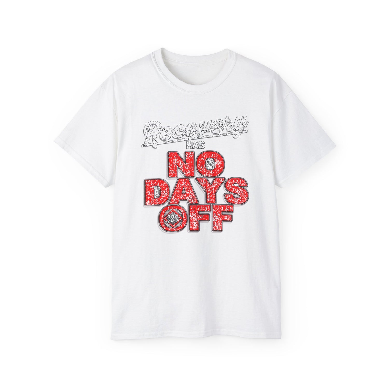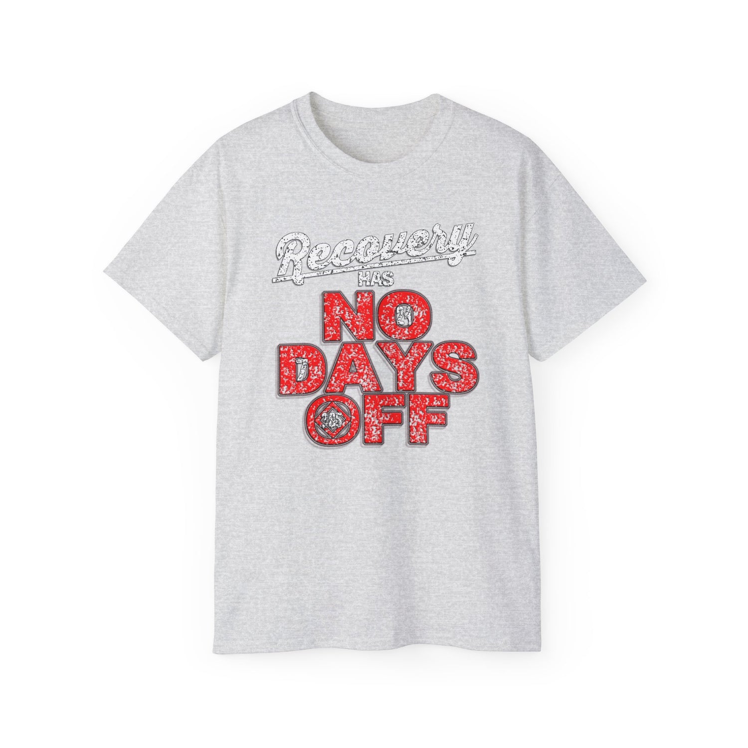 This visually fantastic design carries a simple yet solid recovery message. This shirt features an excellent multicolored design with the words "Recovery Has No Days Off," using a white, black, red, and gray color scheme and effect to make the image pop off the fabric. This design's color and detail are second to none. The image covers a large portion of the shirt's surface area. This image is produced using a direct-to-garment printing process, resulting in a crisp, smooth finish. This classic cotton t-shirt will be an instant favorite in your recovery wardrobe.