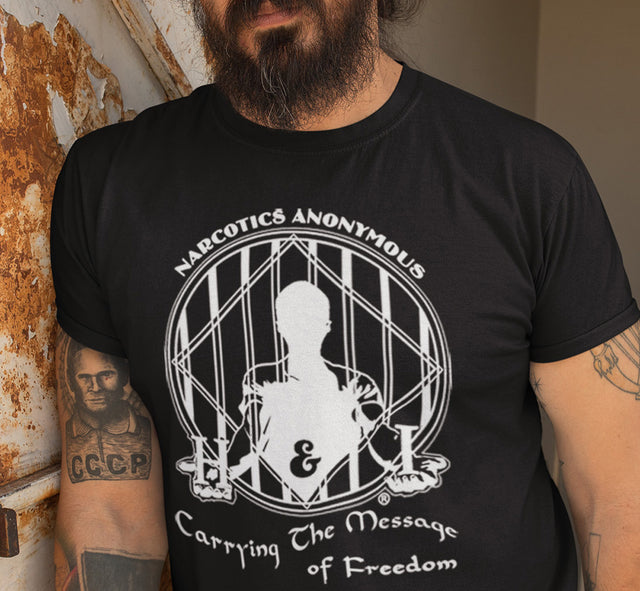 Perfect shirt for those serving on the front lines, carry the message to those who can't get out to a meeting and those who may have never heard of NA before. This design has a 30-year history. It was initially designed for the Greater NY Region of NA in the early 90s and later used for the Behind The Walls publication. This soft 100% cotton tee will surely be an instant favorite in your recovery wardrobe.