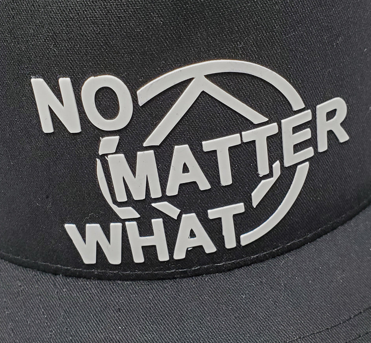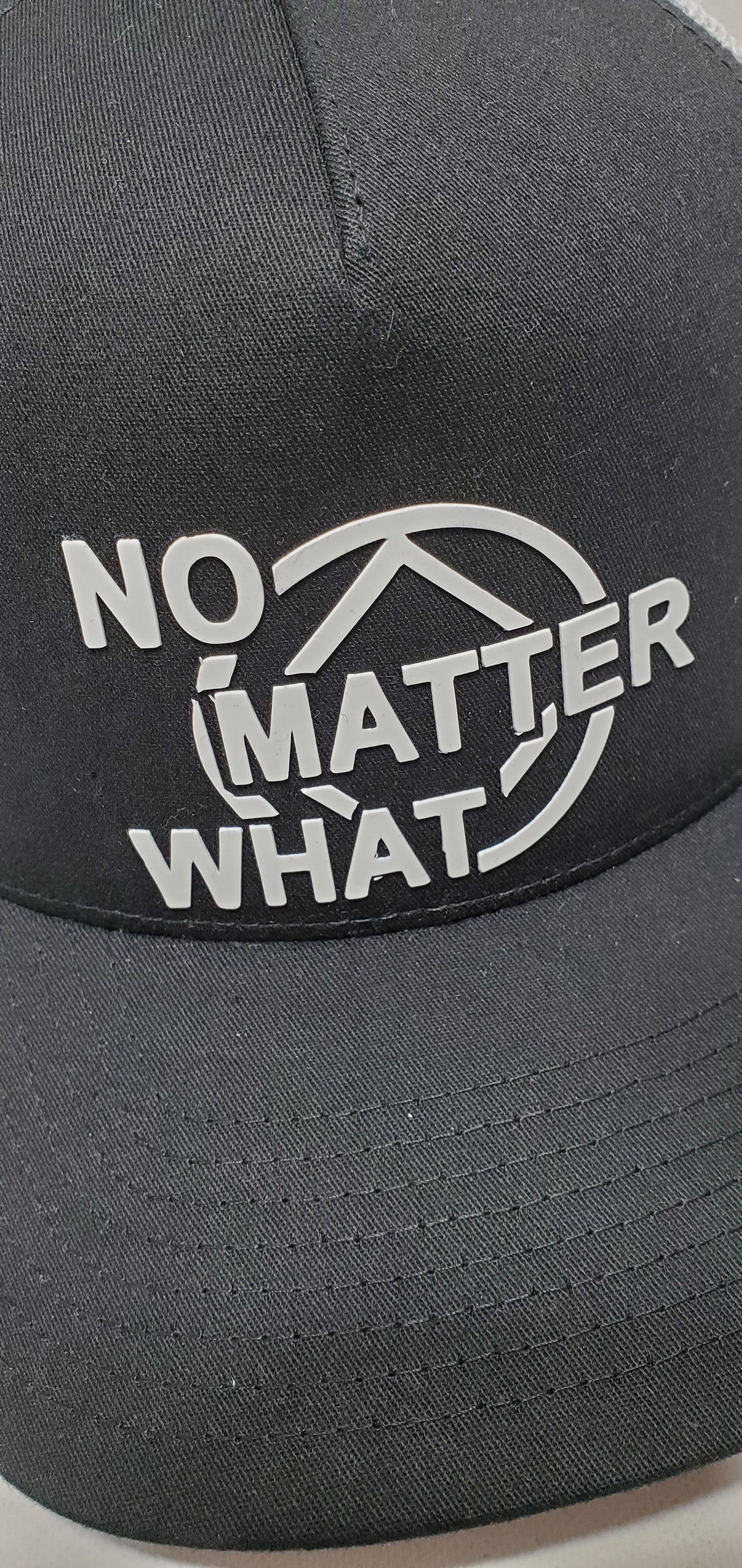 This stylish Snap Back Trucker Cap is Black with white mesh back and a white image. This cap has a cool No Matter What design on it. The smooth yet thick image pop off the hat about 1/8 an inch as you can see in picture.