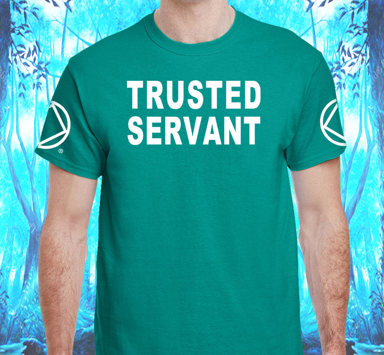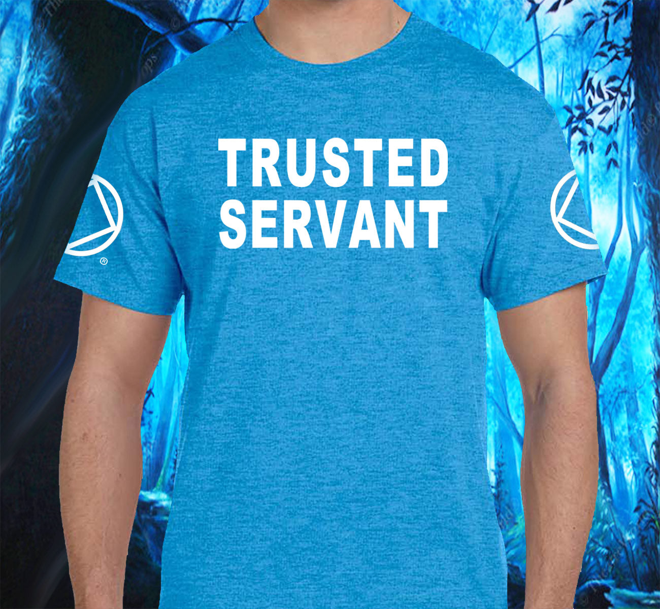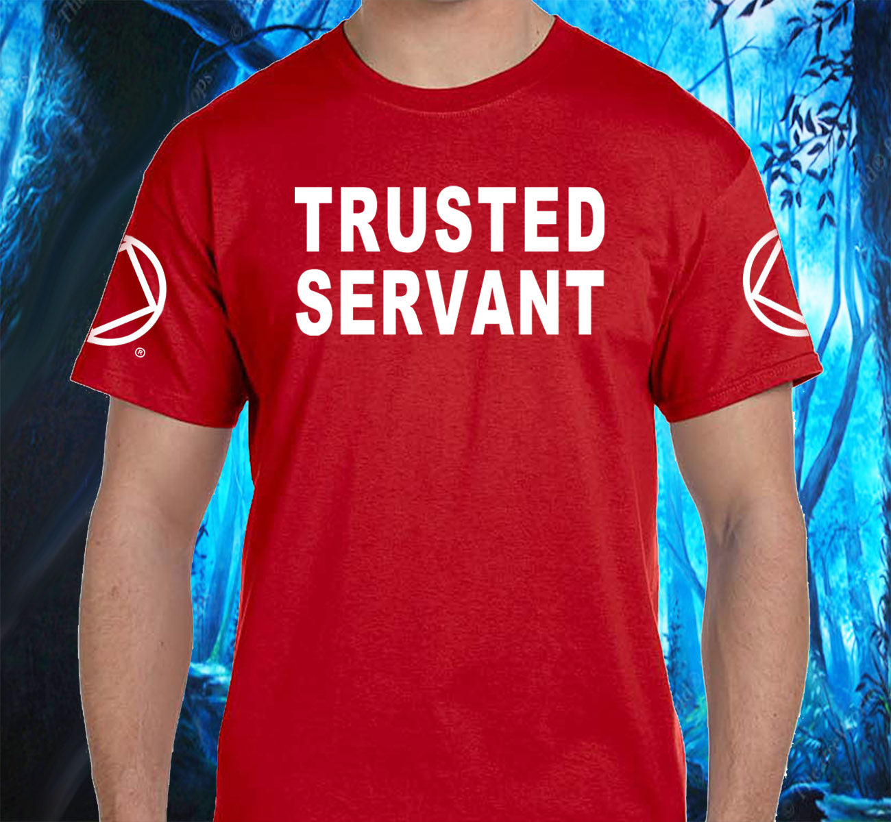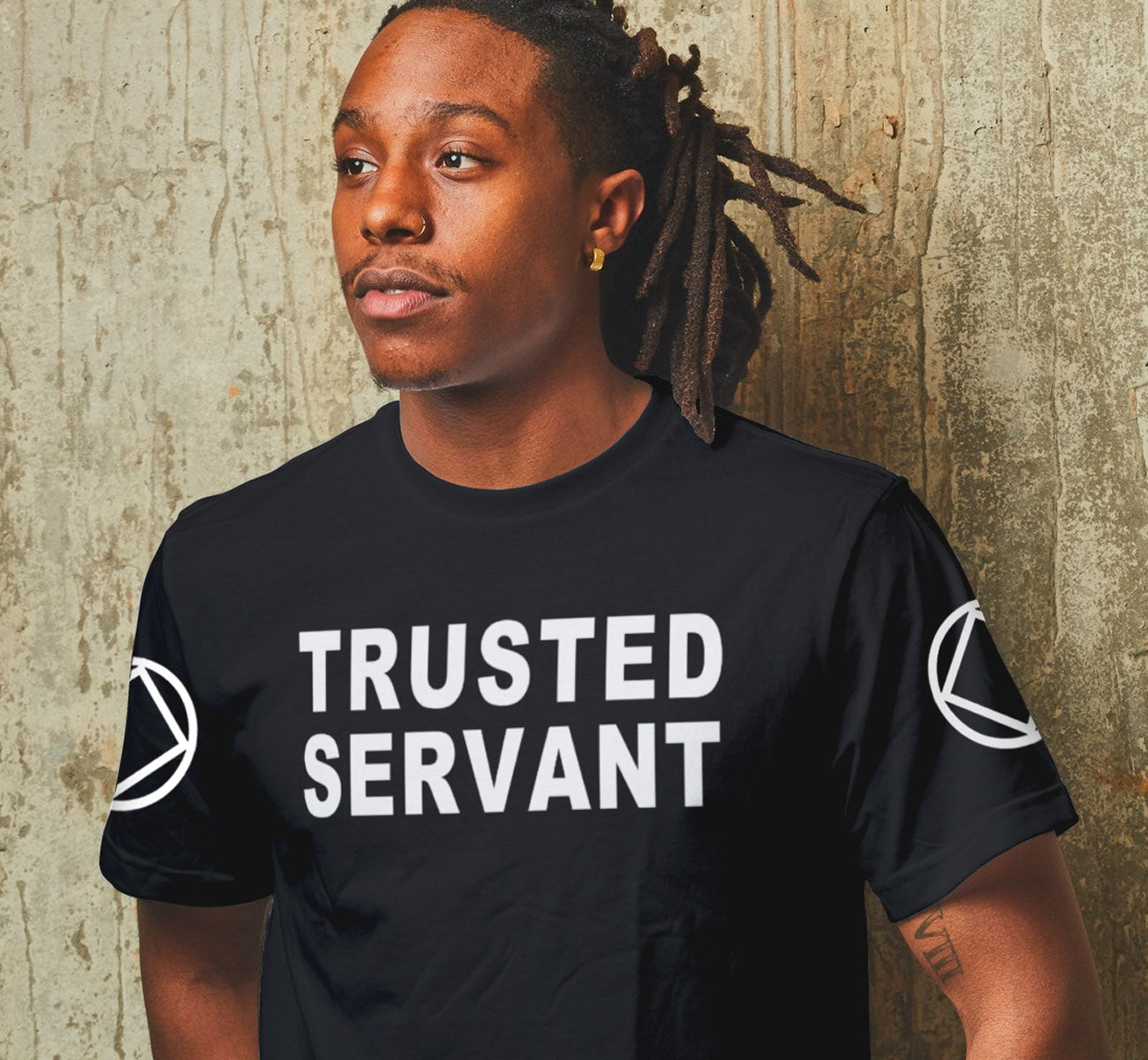 Let everyone know you are a trusted servant with this stylish yet basic design. The shirt features the words "Trusted Servant" on the front, measuring 10" x 5", with two stylishly placed NA service symbols on the sleeves. This high-quality silk-screened shirt will last almost as long as you do. This classic cotton t-shirt will be an instant favorite in your recovery wardrobe.