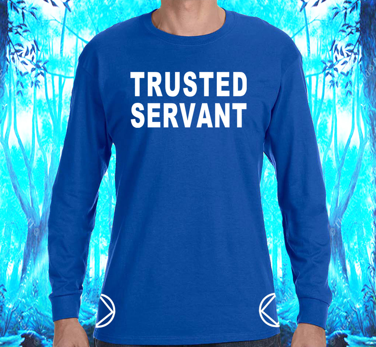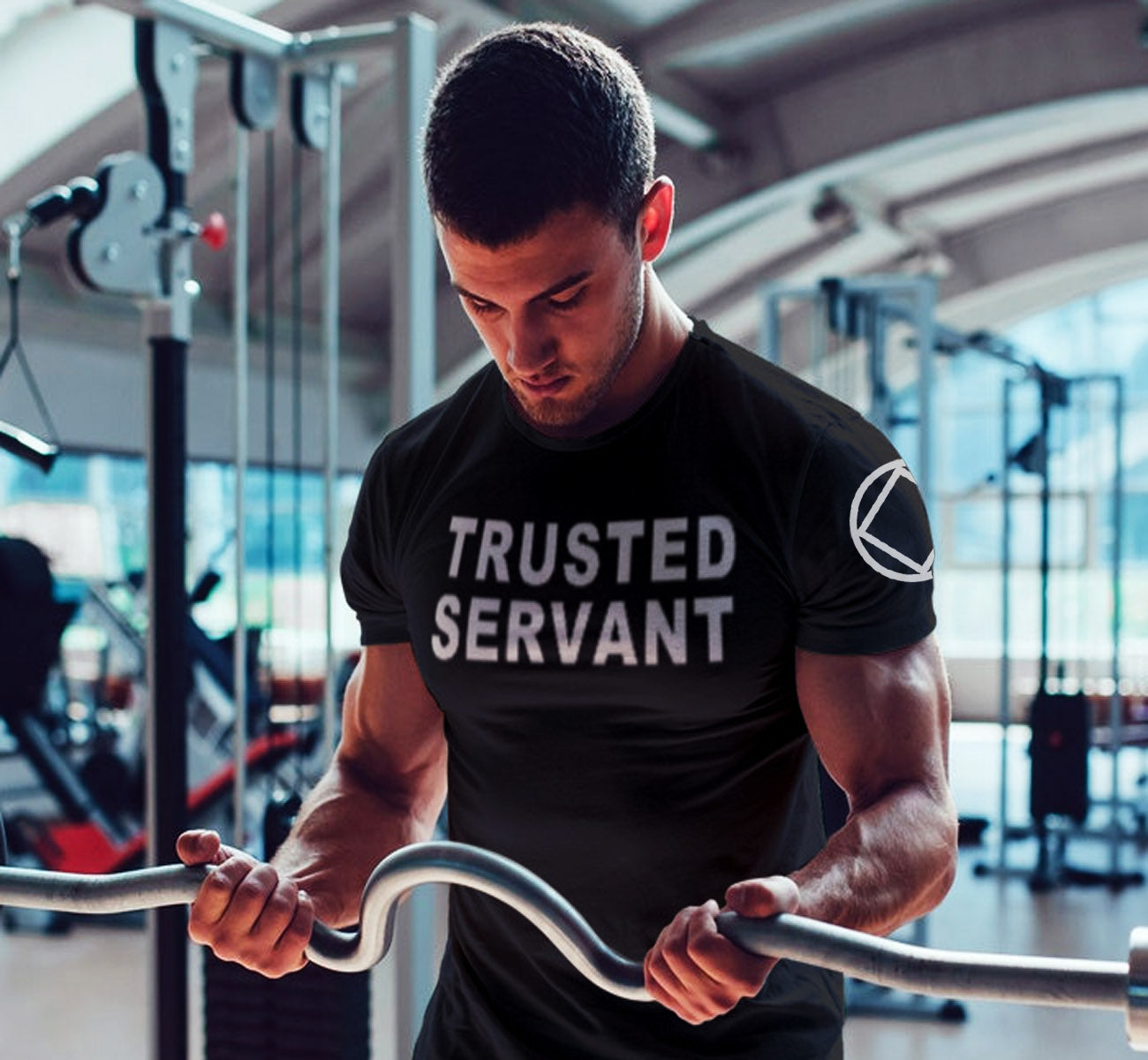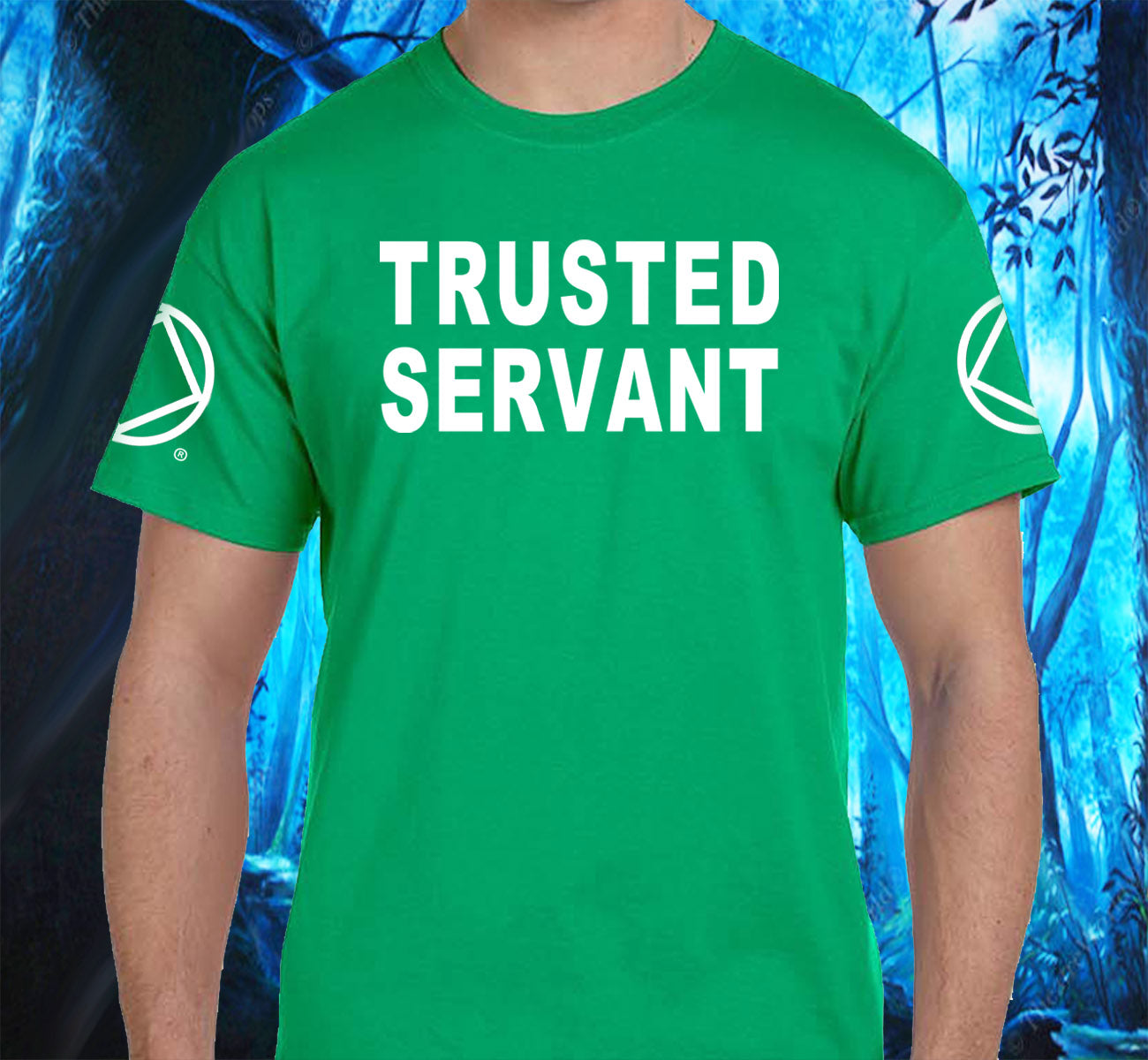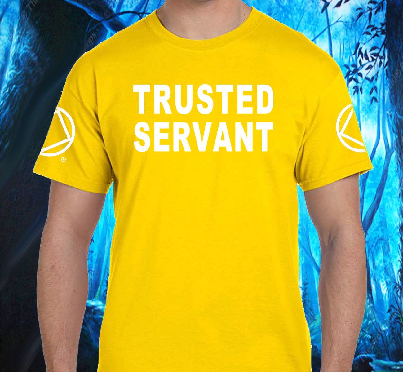 Let everyone know you are a trusted servant with this stylish yet basic design. The shirt features the words "Trusted Servant" on the front, measuring 10" x 5", with two stylishly placed NA service symbols on the sleeves. This high-quality silk-screened shirt will last almost as long as you do. This classic cotton t-shirt will be an instant favorite in your recovery wardrobe.