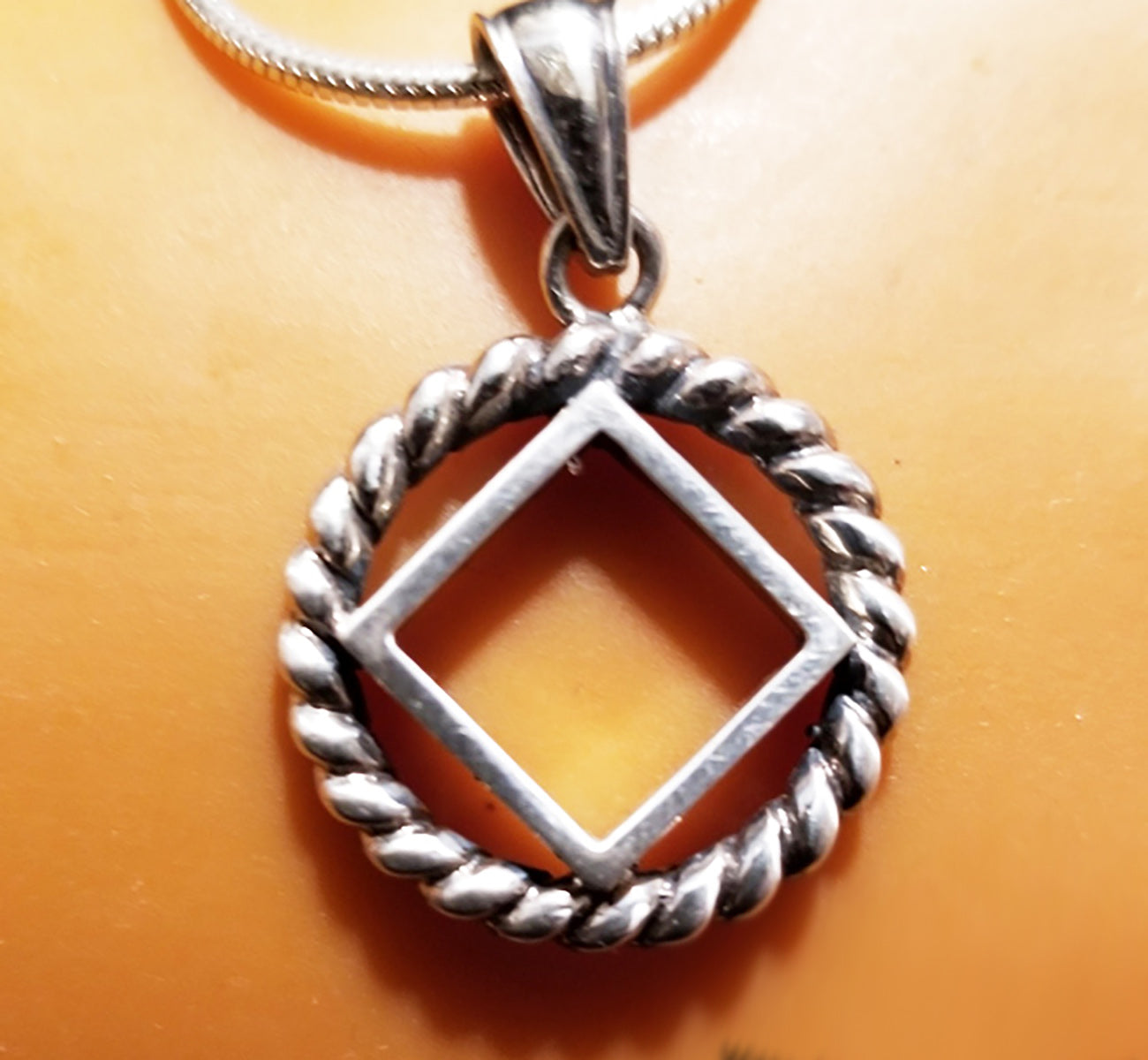 This hand polished sterling silver pendant features twisted wire on as the outer circle and straight edged silver rod as the inter diamond. It is roughly the size of penny. It is solid quality piece and features a medium sized bail to accommodate almost any size chain. Chain not included.