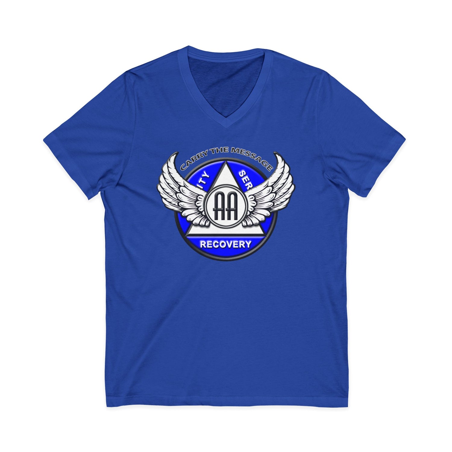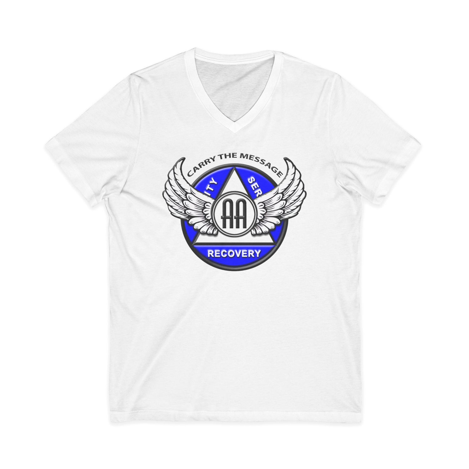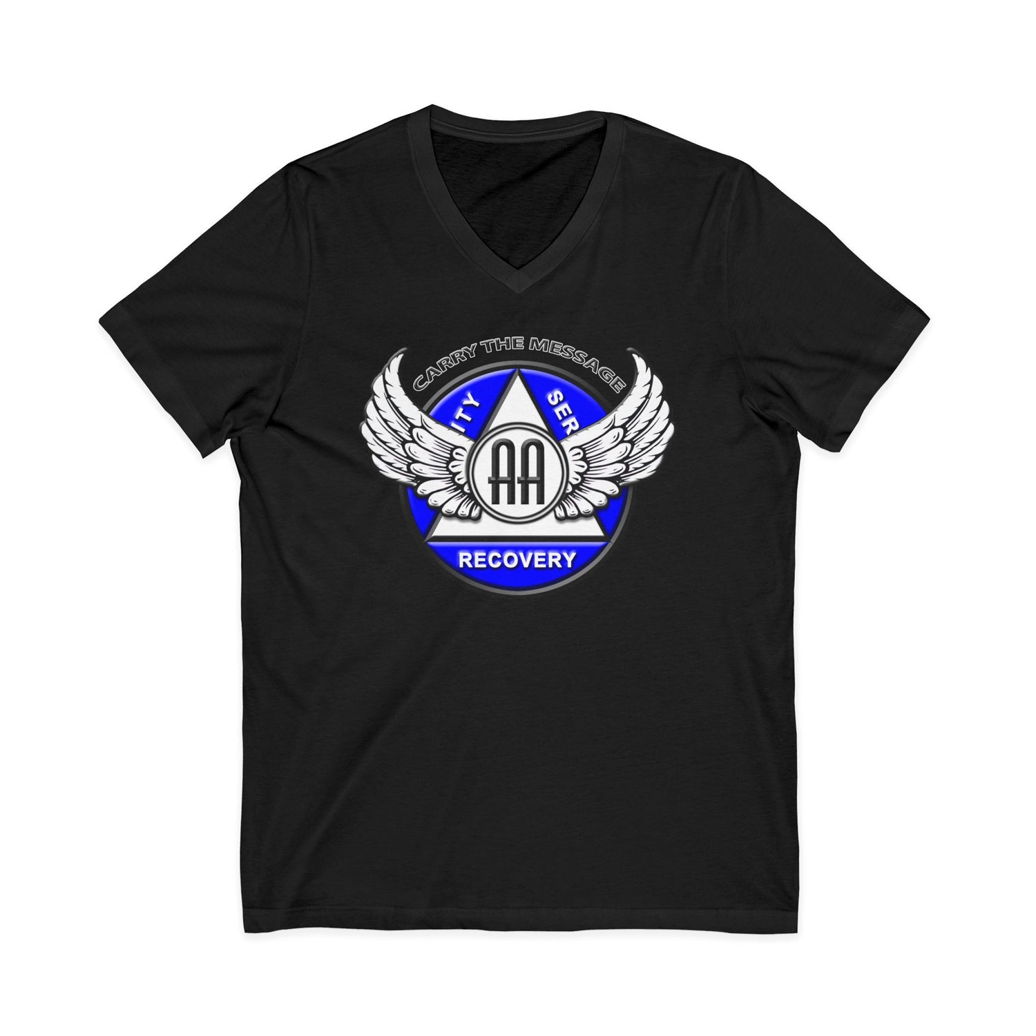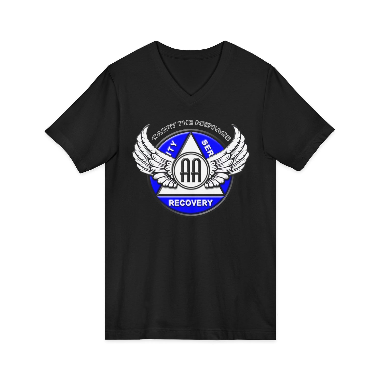 We brought this traditional AA design with a little extra style. I used simple colors, incorporated our message with a pair of wings, and brought it together with some excellent embossing and beveling techniques. The direct-to-garment printing process produces a highly detailed, large, soft-to-the-touch image. The lightweight fabric of these custom V-neck t-shirts makes them a versatile choice for any season, while the 100% cotton ensures a smooth, comfortable wear.